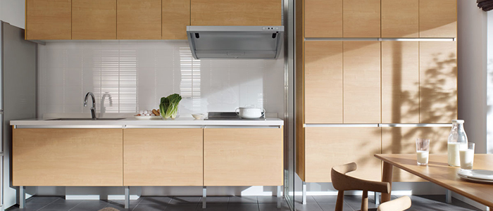 キッチンはコの字型から2列型へ変更。吊戸をなくすことで、より開放的なキッチンへ。家電や食器収納を集約することで、動線がスムーズになるよう工夫しました。